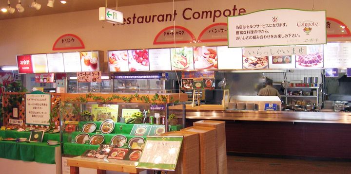 150席あるレストラン「コンポート」はセルフサービス形式のレストラン。展望テラスは360度、雄大な信州の山並みを眺めながら軽食コーナーのフードも楽しめます。