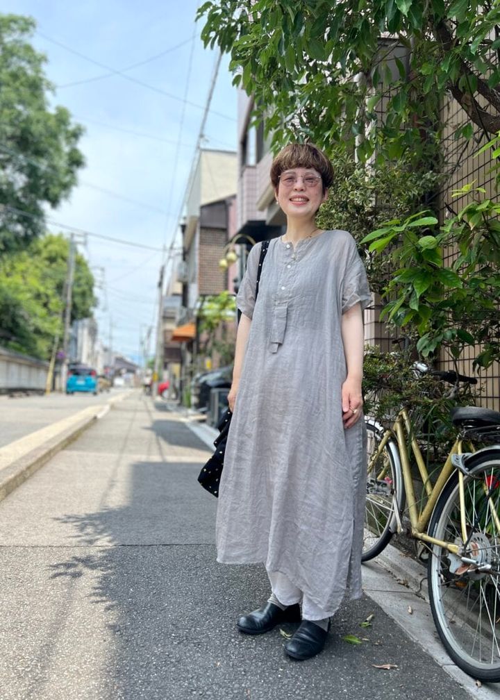 日差しも気温も急にヒートアップした夏日の京都。半袖の麻ワンピースにサングラス姿で、涼やかなスタイリングがきまっていたひろみさん。麻にもいろいろな種類があるので、「湿度の高い京都の夏には、ラミー素材が断然おすすめです」。ボトムスはコットンリネン。「とにかく着心地が良くて、家で洗えるのがいいですね」。