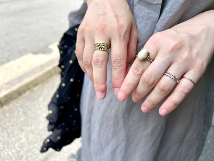 「真鍮のアクセサリーが好きで、ずっと使っています」というひろみさん。右手には大好きな「ヴラスブラム」、左手には、ヴラスブラムの前身にあたるアクセサリーブランド「ケラスス」のリングを。「石のリングは10年以上愛用していて、2代目なんです」。