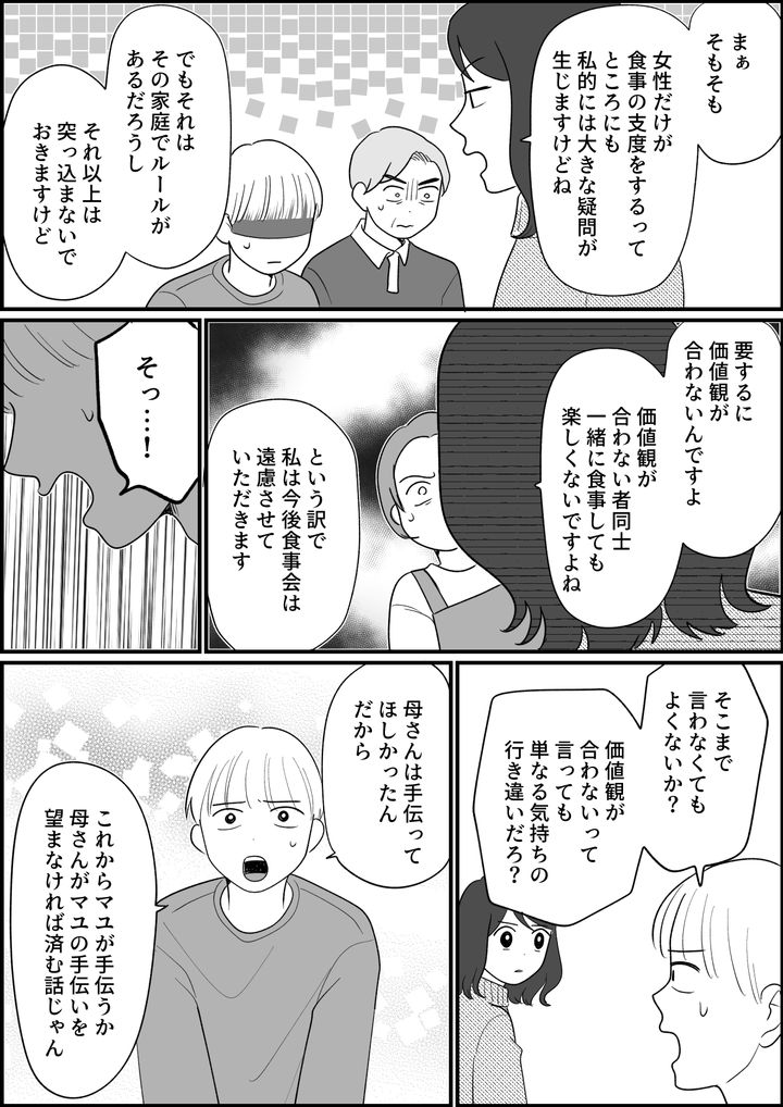 価値観が合わないのであれば、もう食事会にも来ない方がいいと思うと退席しようとすると、夫が私を止めてきたのでした。