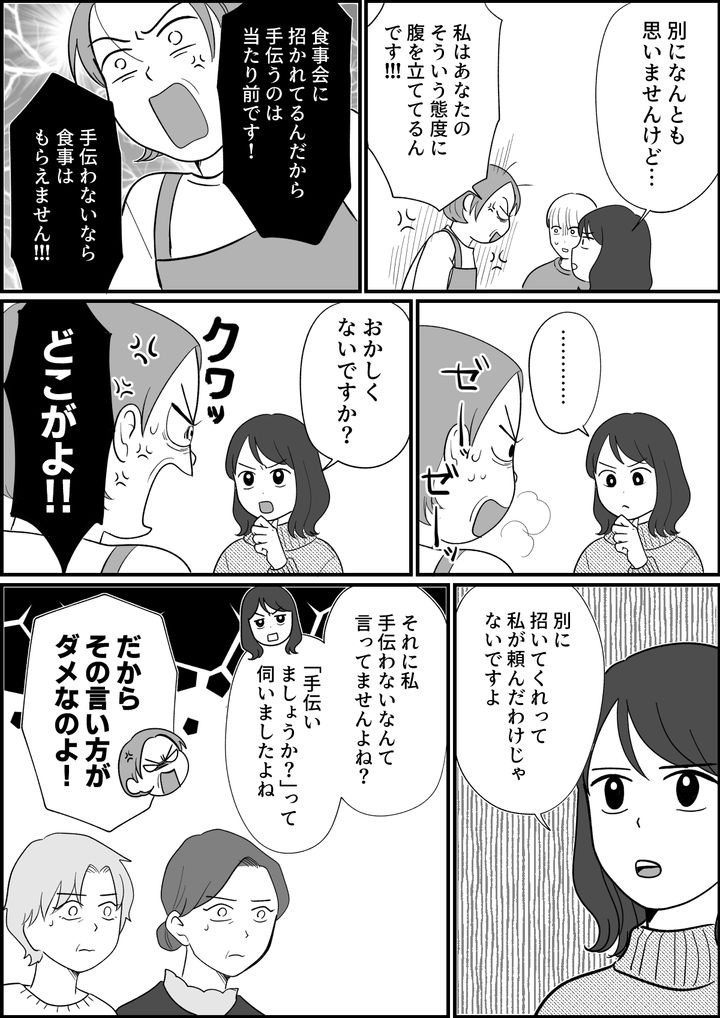 「食事会に招かれているんだから手伝うのは当たり前です。手伝わないなら、食事はもらえません!!!」義母は肩で息をしながら、思いっきり私に訴えかけてきました。