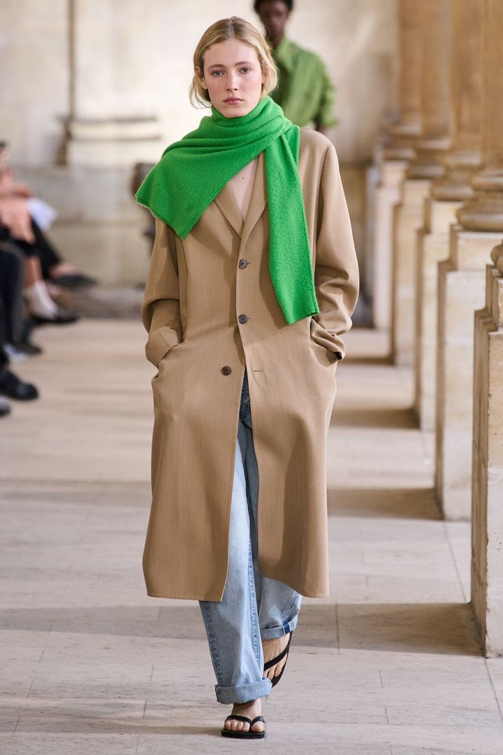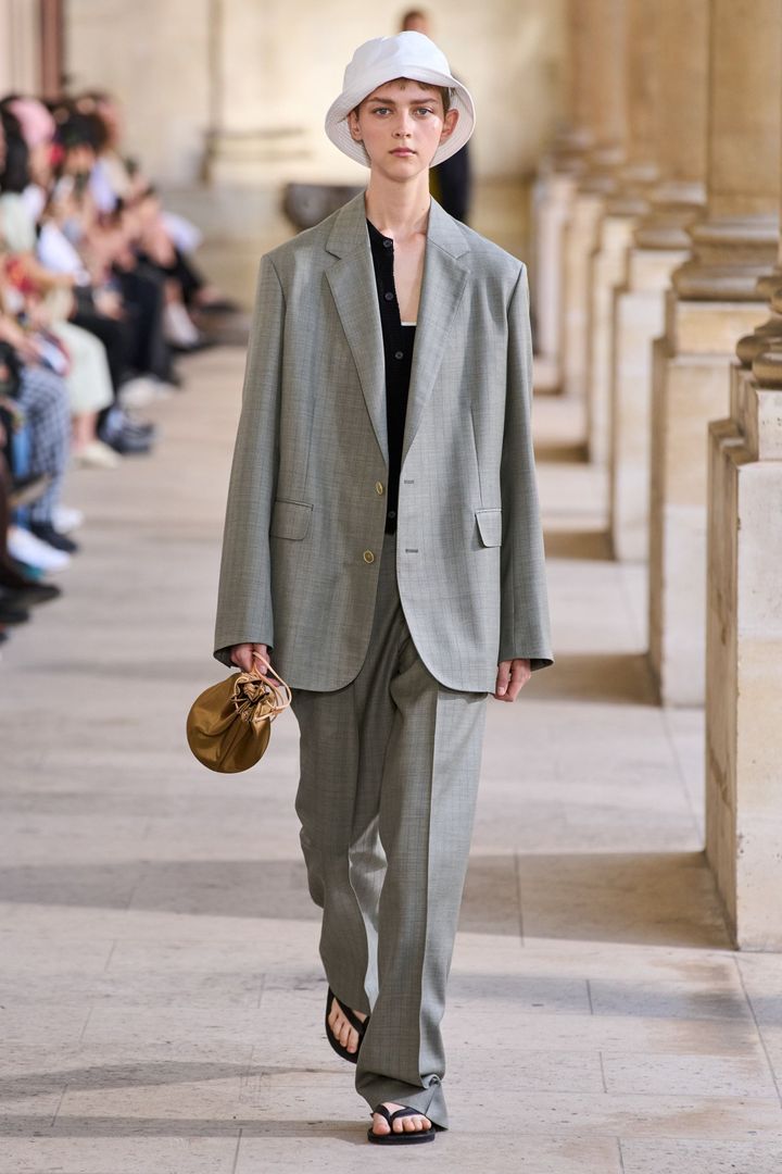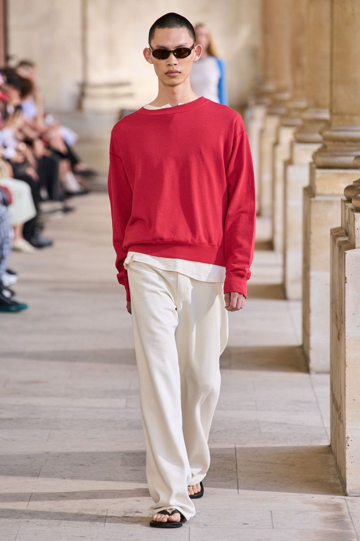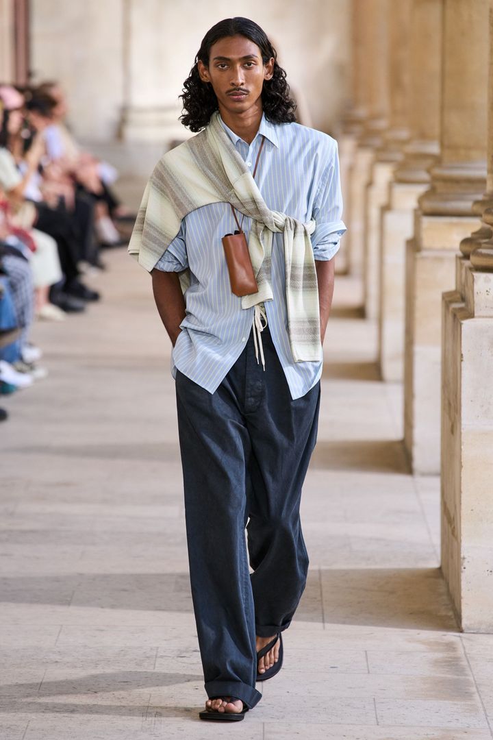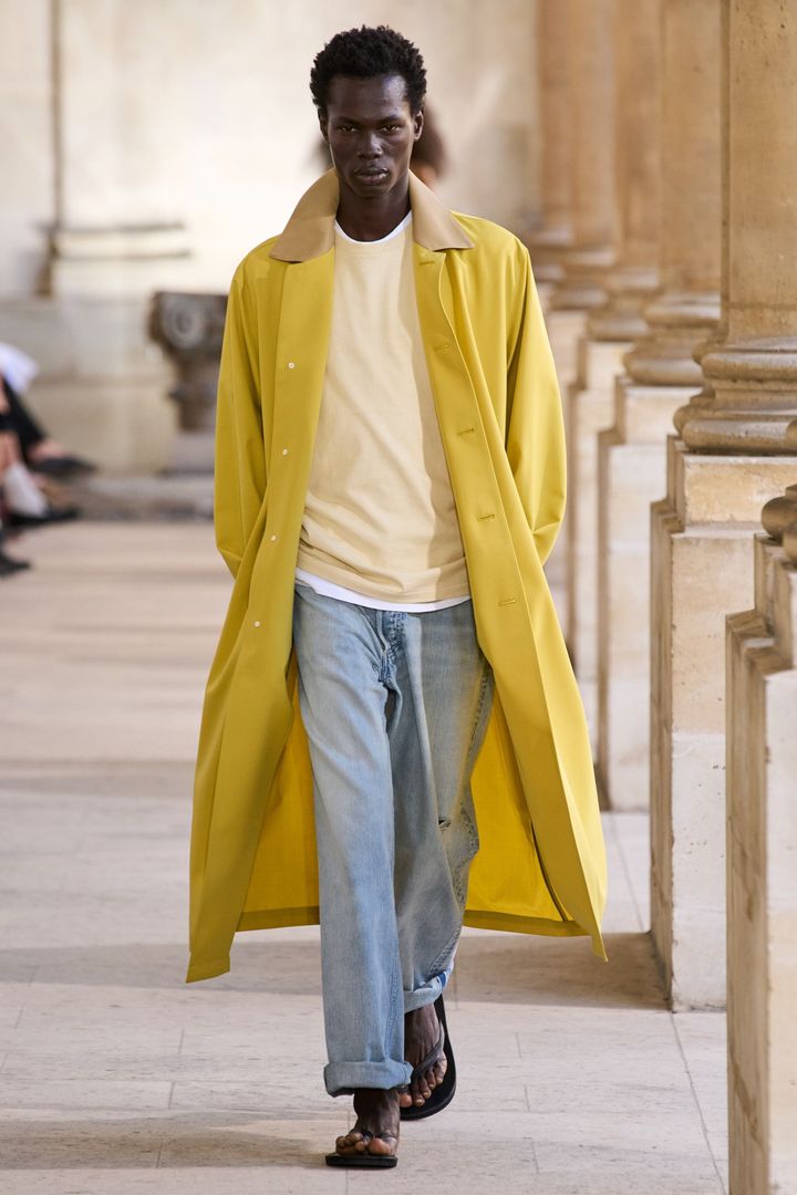 ところで、ここ最近ビーチサンダルを取り入れたメンズコーデが話題となっている。つい先週、俳優のジョナサン・ベイリーはロンドンで行われた『ジュラシック・ワールド/復活の大地』のプレミアイベントに、ビーチサンダルを履いて出席した。フットウェア含め全身ザ・ロウTHE ROW)だったとはいえ、そのルックはネットで賛否両論を呼んだ。岩井も今回は、ほぼすべてのルックに今話題のビーチサンダルを合わせていた。プラダPRADA)やルイ・ヴィトンLOUIS VUITTON)のメンズショーにも登場し、何かとトレンドになっているこのシューズだが、岩井はこのようなカジュアルで身近なアイテムを、手に届く憧れのアイテムとして見せるのを得意とする。少し背伸びすれば着こなせるワンランク上のワードローブを、オーラリーは今季も打ち出したのだった。