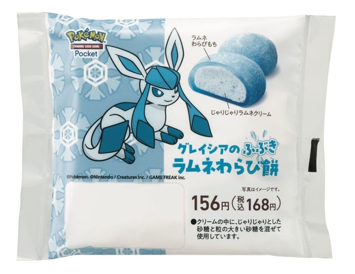 グレイシアをイメージしたわらび餅は税込168円です。氷をイメージしたじゃりじゃりとした食感が楽しいラムネ味のクリームをわらび餅で包んだスイーツは蒸し暑い今の時期にピッタリ。見た目の青さも爽やかでいいですよね。