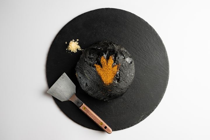 竹炭を練り込んで焼き上げた真っ黒なナン。中身はマイルドなバターチキンとカマンベールチーズを合わせたカレーで、子どもも食べやすいのが嬉しいポイント。
