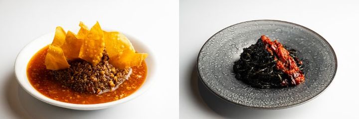 右:ヒルズ ダル・マット「漆黒の山形牛ラグー 溶岩がけ」