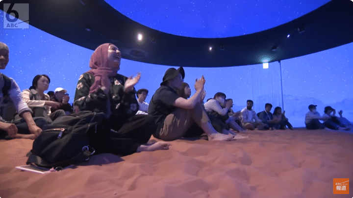 展示室には、ヨルダン砂漠地帯の保護区「ワディ・ラム」の赤い砂が敷き詰められています。ワディ・ラムは数々の人気映画の撮影地としても知られる有名な砂漠。360度スクリーンに映し出される砂漠の映像に囲まれ、砂の上に腰を下ろしていると、まるで現地にいるかのような気分が味わえるのです。