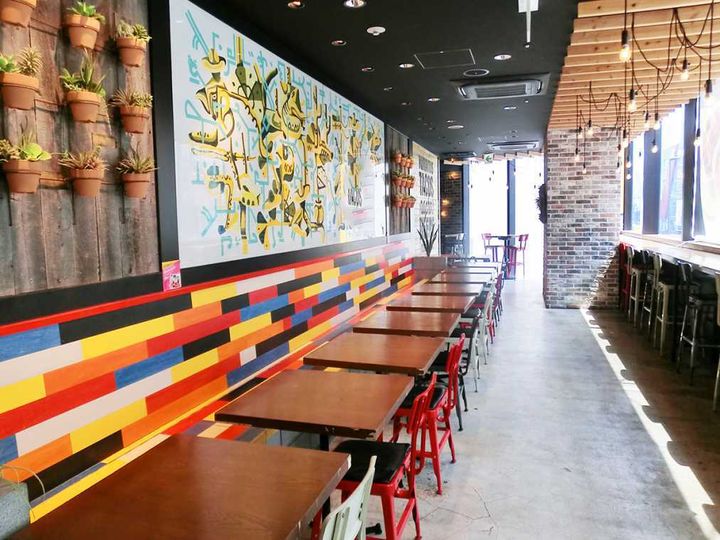 世界に100店舗以上を展開する、オーストラリア発祥の有名メキシカンキッチン「Guzman y Gomez(ぐずまん いー ごめず)」ラフォーレ原宿店はおしゃれなインテリアも魅力のひとつ! 壁にはメキシコ人トップアーティストの作品が飾られてポップな雰囲気です。ランチには多くの若者や外国人で賑わっています。