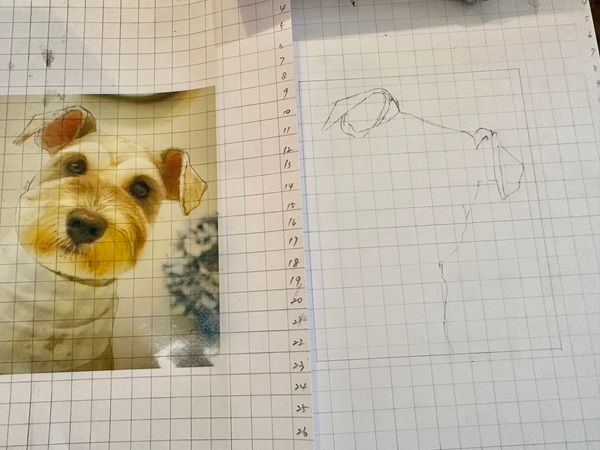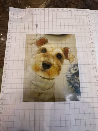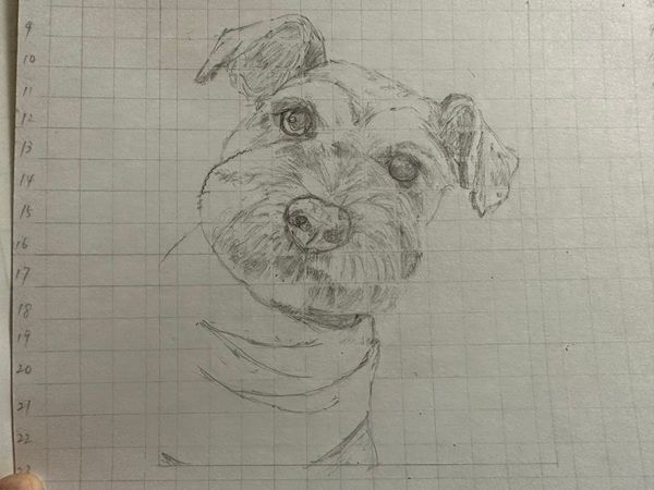準備が整ったら早速鉛筆で下描きです。 どこから描こうかなと悩みながら 私は耳から描いていくことにしました。 次に輪郭。絵を描くと言う感覚ではなく、マスの中の図を書き写す感じなので絵が得意でなくても自然と上手に描けちゃうからびっくりでした。 わからなくなるとその都度優しく教えてもらえるのでどんどん楽しくなりましたよ。