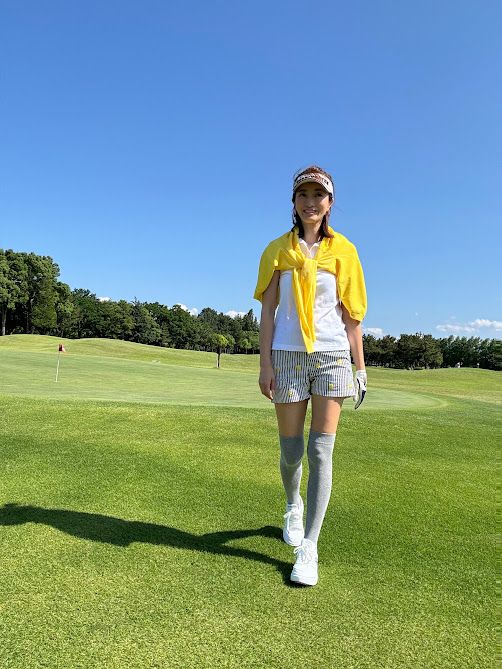 【コーデのポイント】ノースリーブのポロシャツとショーパンで暑さ対策を。薄手のカーディガンとニーハイソックスで日焼け対策を考えた初夏のゴルフコーデです。ショーパンのバナナ柄のイエローを拾って、カーディガンもイエローで揃えて統一感のあるコーデを意識。イエローは大好きな色なので、グレーで締めて気分がアガるスタイルに仕上げました。