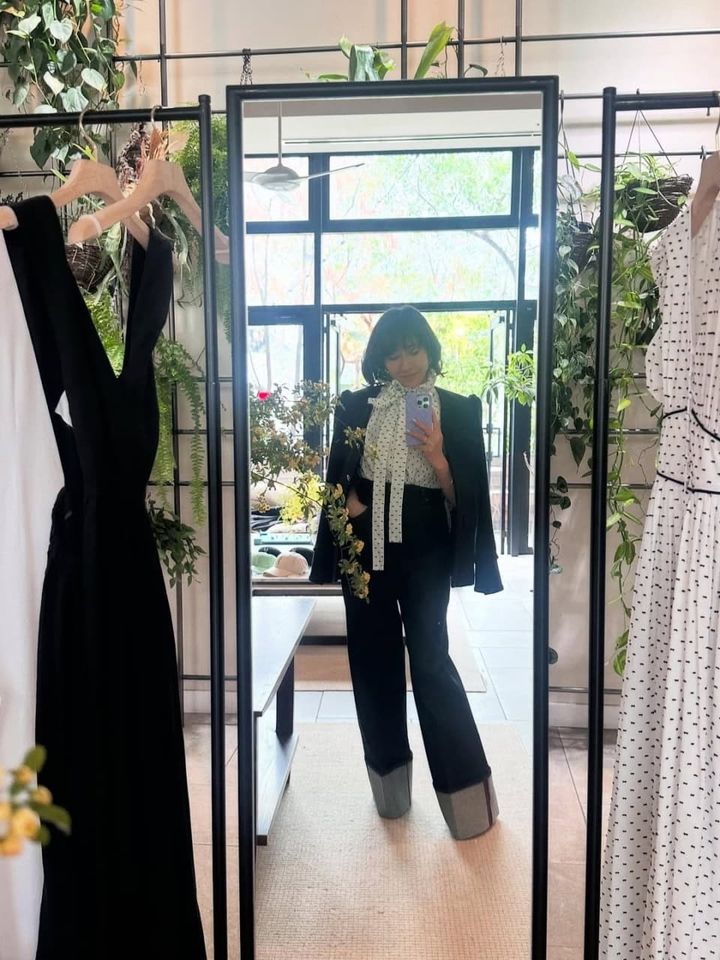 女性らしいボディラインを素敵に見せてくれる、ツータックのデニムパンツもキープ中。「いつもなら、こんなロマンティックなキャミソールはブラックを選ぶんだけど、このデニムに合わせて着たいから、水色にしようかな」。