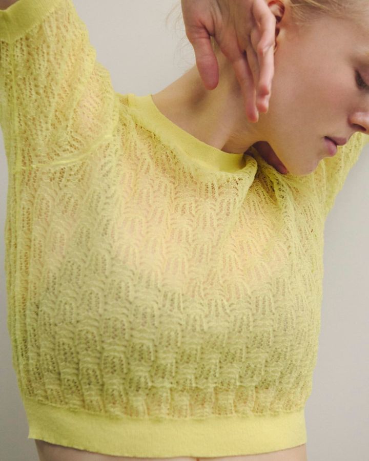 繊細なレース柄編みのクロップドレースニットトップは、ローカットブラ付き。¥31,900