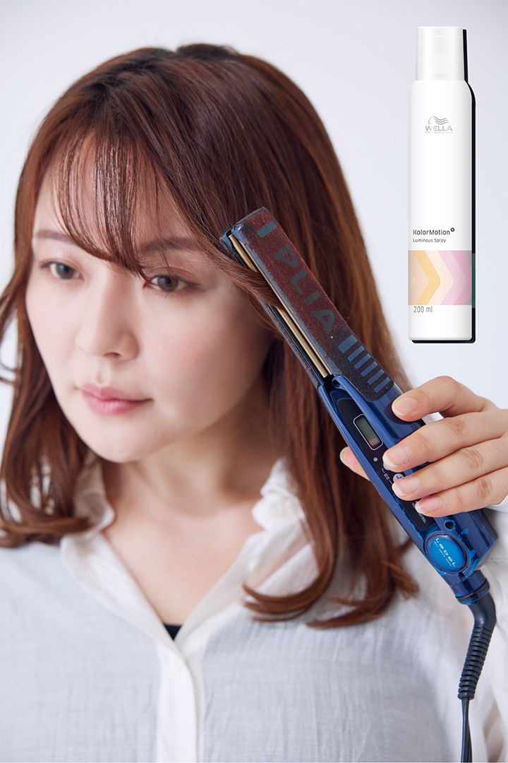 ストレートアイロンか、32㎜や38㎜の太めのカールアイロンのどちらでもOK。目元から流れるように巻いて。最後にオイルスプレーを吹きつけてツヤを与え、スタイルをキープ。