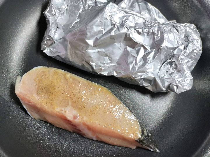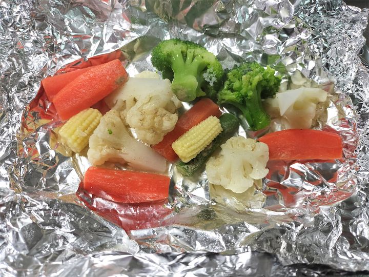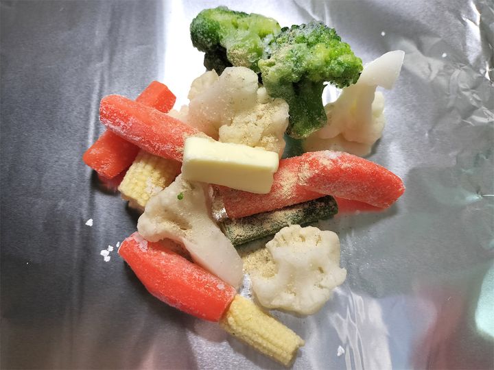 1. アルミホイルに冷凍野菜を乗せ、軽く塩とこしょうを振ってからバターを乗せて閉じるように包みます。