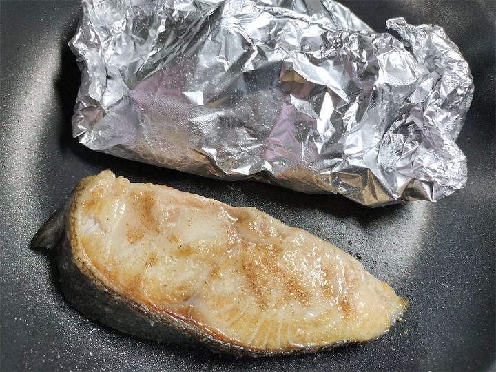 4. 白身魚を裏返し、さらに2分強フタをして焼きます。