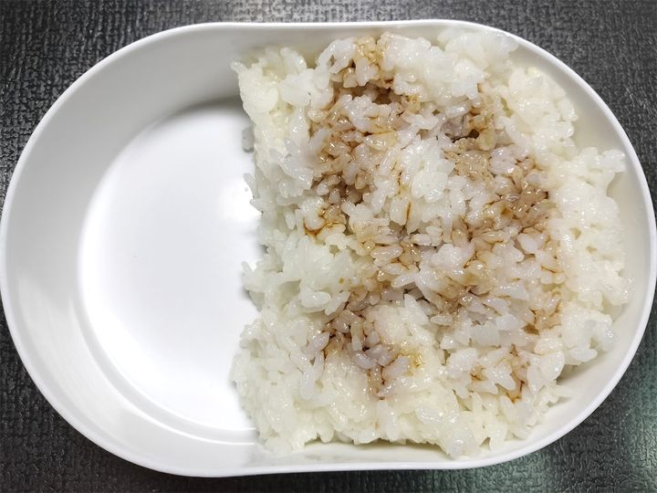 8. ご飯を弁当箱の片側に寄せて盛り、上に軽くしょうゆをかけます。