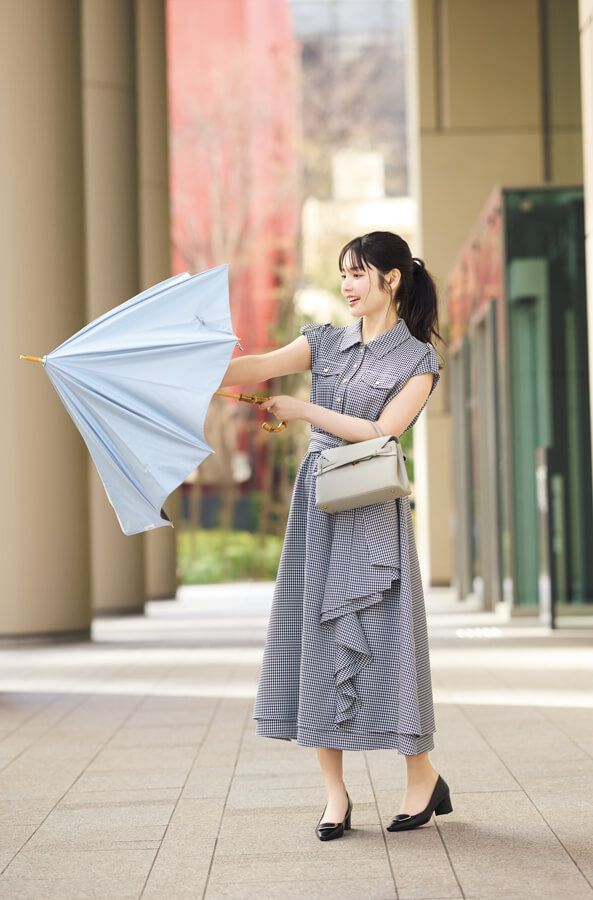 通勤服に合う日傘が欲しい!ギンガムワンピにブルー傘の色差しで夏の清涼感をトッピング♪
