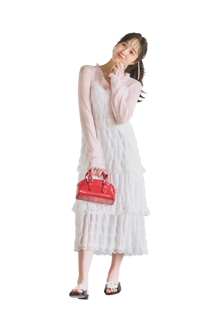 甘さ満点なティアードワンピをあわせれば簡単にロマンティックコーデの完成。赤のバッグを差し色にしてこなれ感も◎。