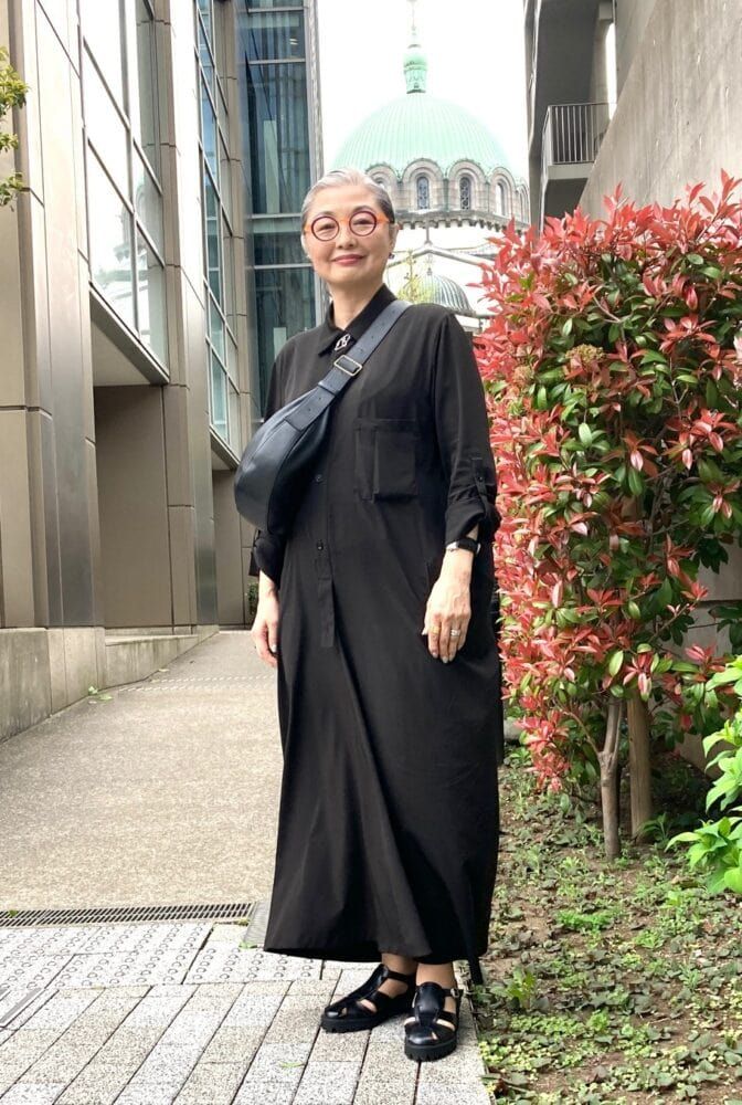 上品な黒のワンピースと、それを彩るような斬新なカラーリングのメガネがお似合い。ブラックコーデを軽やかに着こなしていらっしゃいます。「グレイヘアにしてからは、ブラックやネイビーの洋服を着ることが増えました。『ワイズ』のワンピースは、シンプルで着こなしやすいアイテムです」。ワンピースがシンプルな分、小物でアクセントをつけたスタイリッシュなコーディネート。