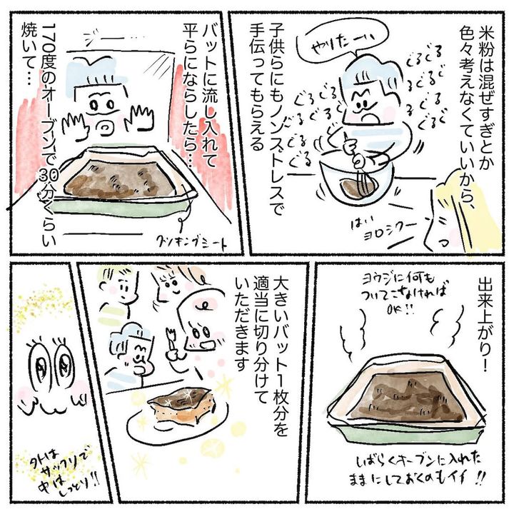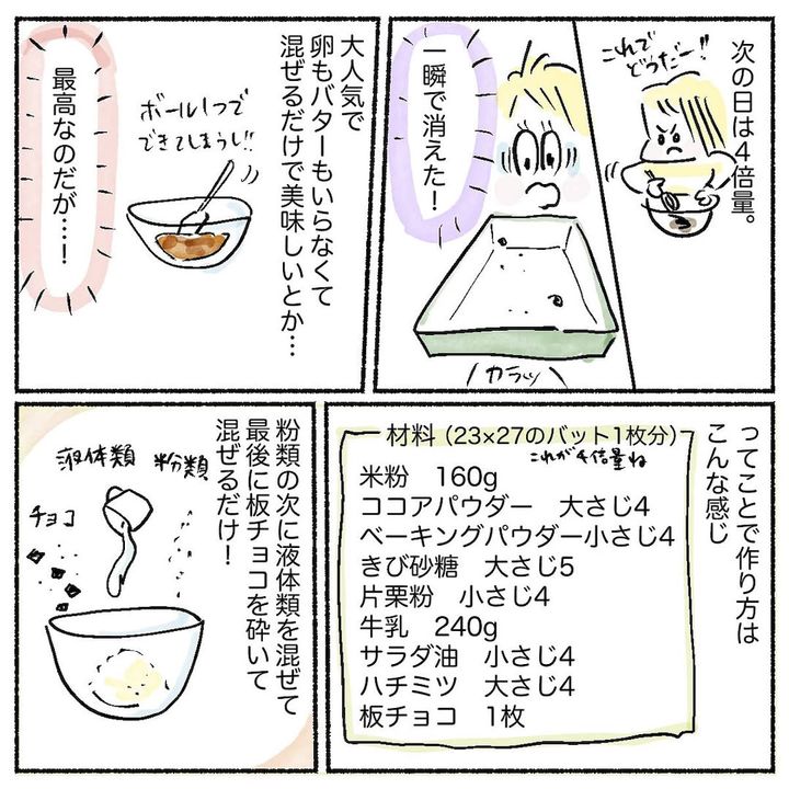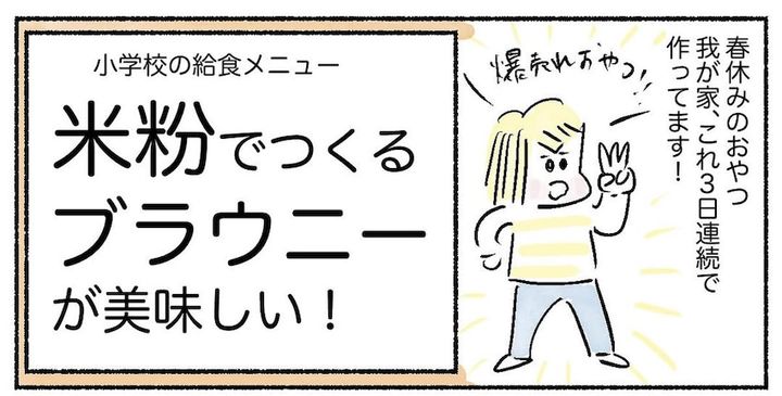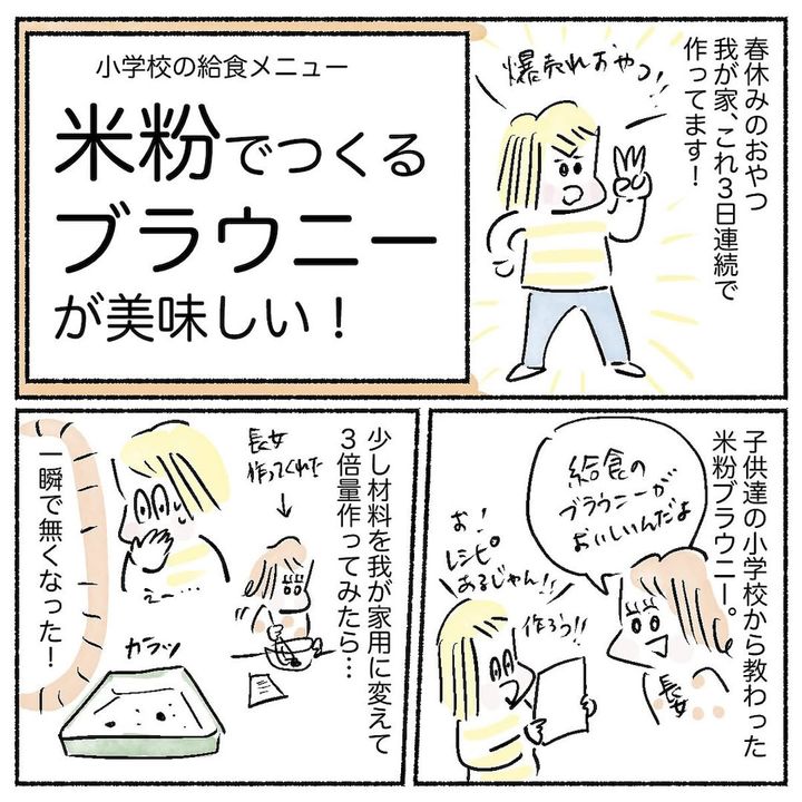 こんにちは!4児の母で漫画家兼公認会計士のAyumiです。みなさんは学校給食で何の献立が好きでしたか?カレーライスや揚げパンは今でも人気メニューですが、わが家の子どもたちに大人気なのが「米粉ブラウニー」。給食でブラウニーが出てくるなんて、時代を感じますね~。卵もバターも使わないのに、ものすごい勢いで食べてくれるんですよ!肝心の作り方は…以下の漫画をご覧ください♪
