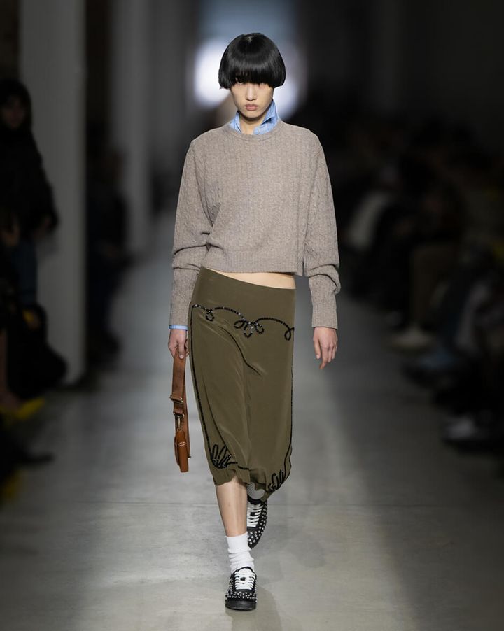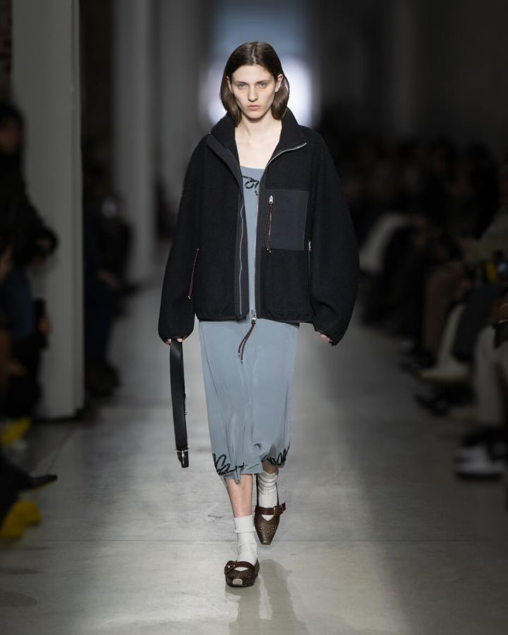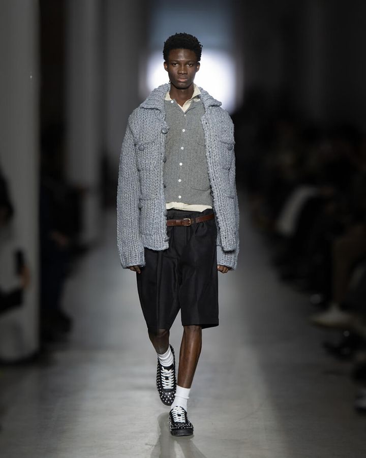 また、ゴープコアスタイルから着想を得たダブルフェイスのフリースジャケット風ジップアップや、オーバーサイズのハンドニットカーディガン、ケーブル編みのウールニットのツインセットがユニセックスで展開され、個のスタイルに自由な解釈をもたらす。
