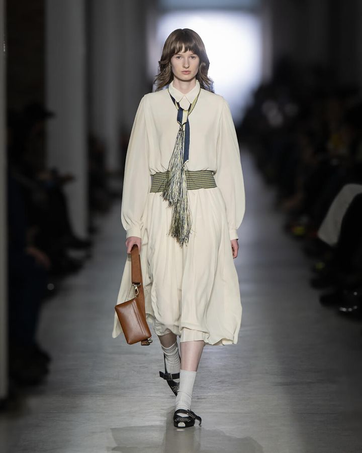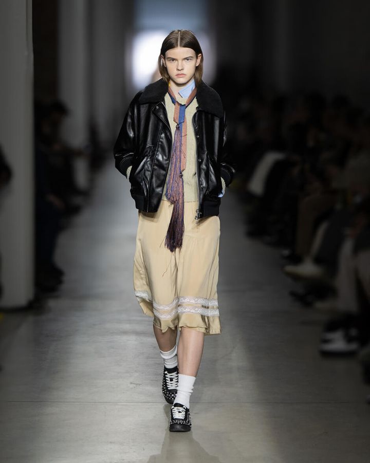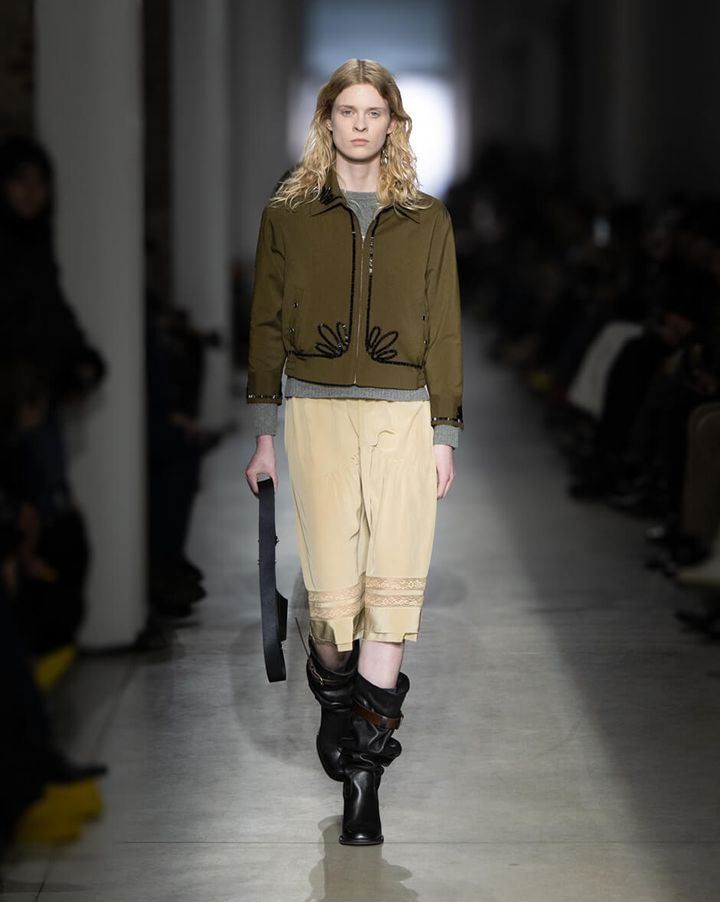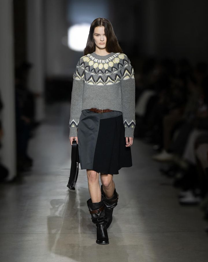レースをあしらったドレスとブラウス、手刺繍のノルディック柄セーター、波打つアシンメトリーなスカート、コーデュロイの襟を備えたコーティングコットンジャケットには、ロマンティックなムードと力強さが共存する。