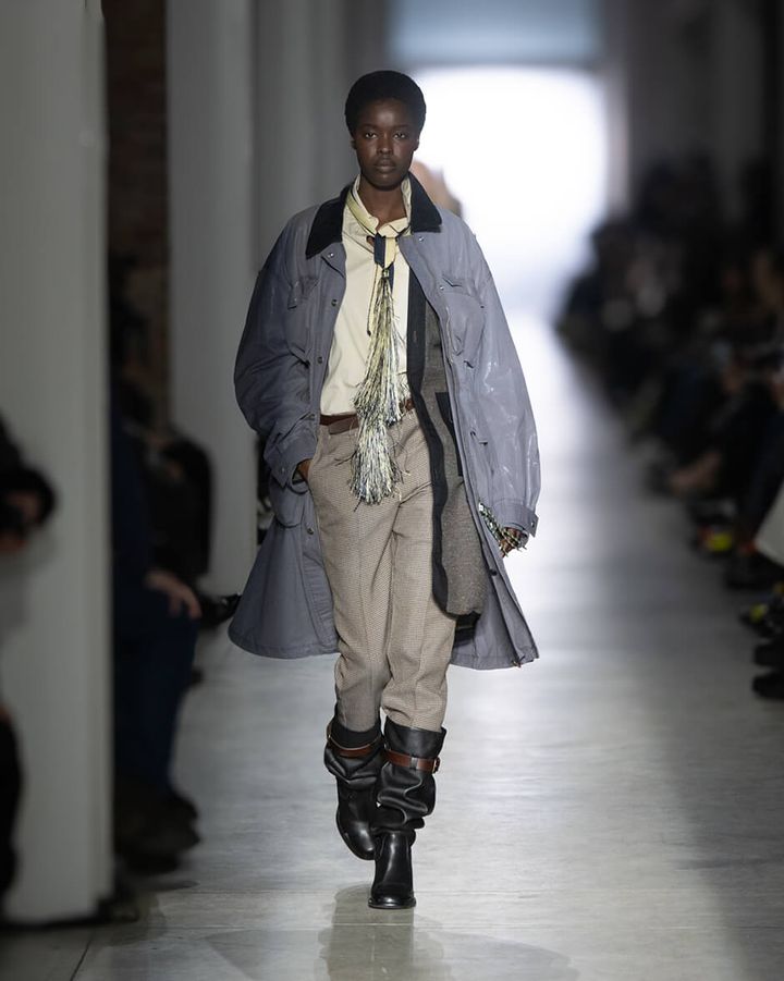 コレクション全体にこの街に息づく多様な個性、美的・文化的な融合が投影され、ナローなシルエットが新たな美を生み出している。