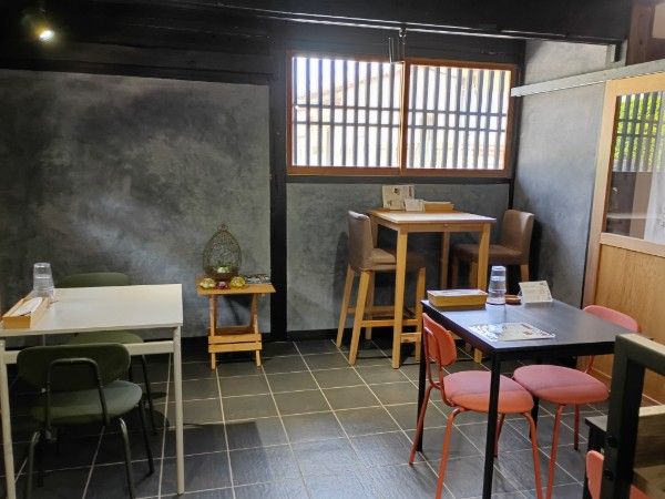 1階はカフェ「琥珀と車輪」や地鶏焼き「sumiya 菜恵の麓」のレストラン。