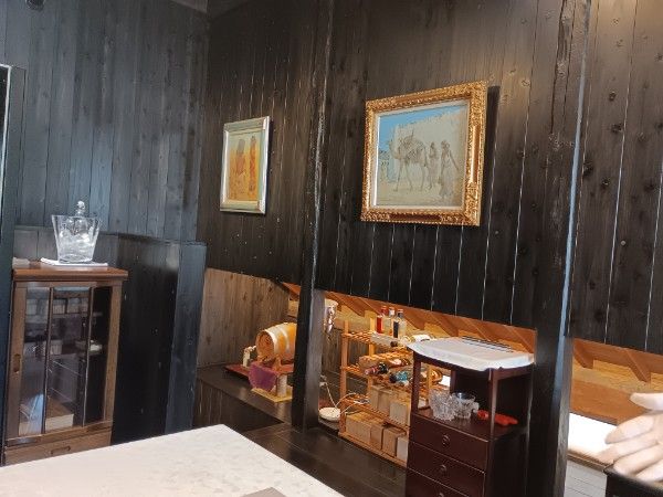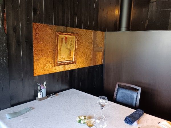 黒い壁がシックで天井も高く、グラスやお花、器が引き立ち、雰囲気がとっても素敵です。