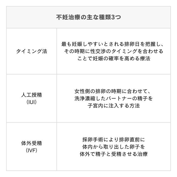 タイミング法は、最も妊娠しやすいとされる排卵日を把握し、その時期に性交渉のタイミングを合わせることで妊娠の確率を高めます。 人工授精は女性側の排卵の時期に合わせて、洗浄濃縮したパートナーの精子を子宮内に注入する方法です。 体外受精等の生殖補助医療は採卵手術により排卵直前に体内から取り出した卵子を体外で精子と受精させる治療で、3種類の中での最終ステップとなります。