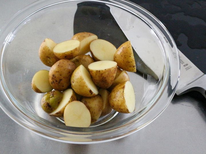 1. 新じゃがをよく洗って食べやすい大きさに切り、耐熱容器に入れてラップをかけ600Wの電子レンジで3分加熱する。