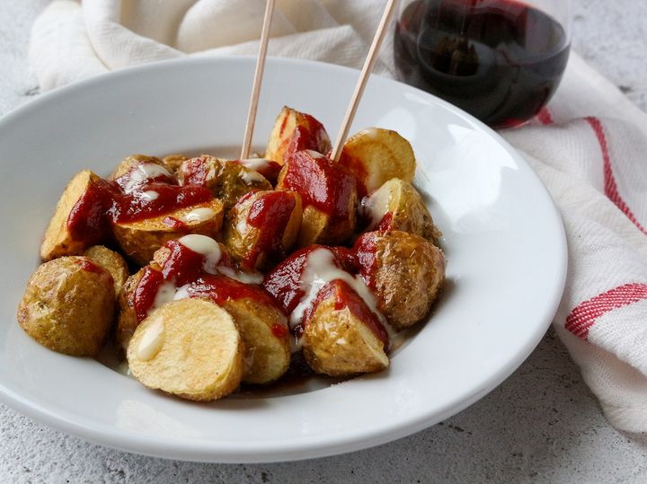 ※揚げたポテトに「ブラバスソース」というパプリカをベースにしたスパイシーなソースと、ガーリック入りのマヨネーズである「アリオリソース」をかけた料理。