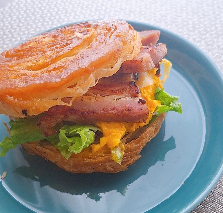 市販のクイニーアマンを半分にカットし、レタス、こんがり焼いたベーコン、半熟オムレツをのせてサンド。