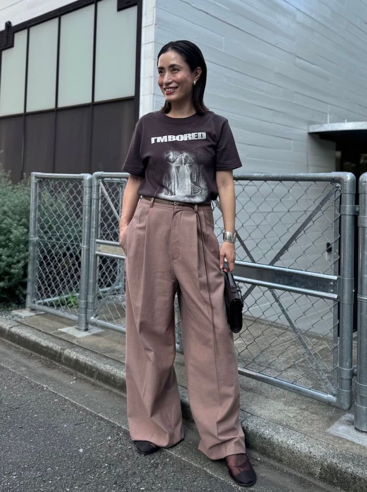 【40代スナップ】次なるトレンド「ブラウン」系のTシャツレイヤードが洒落てます|高岡瞳さん