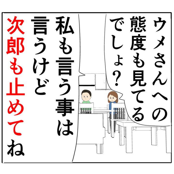 義母に反論した義兄嫁のウメさんを義母があからさまに目の敵にしている様子をずっと見ていたさくらさんは「ウメさんへの態度も見てるでしょ?私も言う事は言うけど、次郎も止めてね」と、自分もウメさんと同じような態度を取られるだろうと心配します。