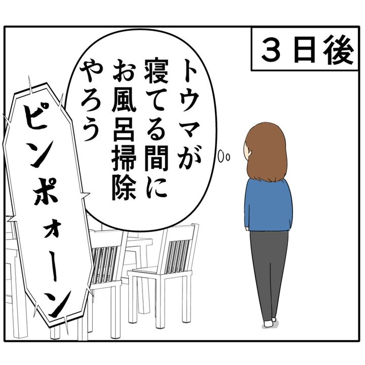 話し合いから3日後。息子のトウマくんがお昼寝をしたのでさくらさんが今のうちにお風呂掃除をしようとしていると、「ピンポーン」とインターホンが鳴りました。