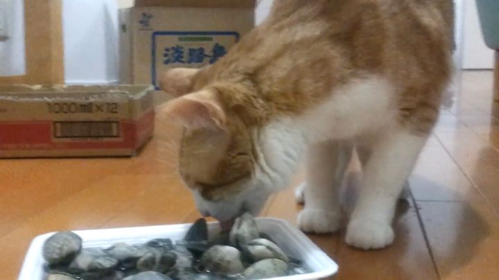 危機管理意識の薄い茶白猫、貝の入ったお水を飲み出す