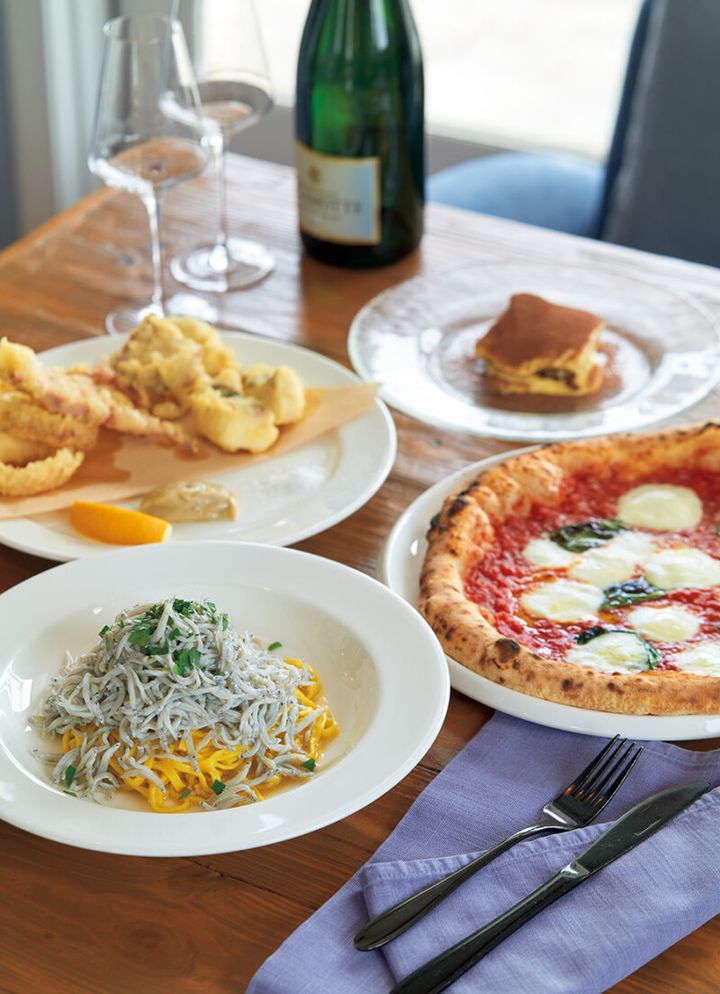 しらすのペペロンチーノ ¥2 ,420、ピザ窯で焼き上げたマルゲリータ¥2 ,420、相模湾で獲れた魚介をさっくりと揚げたフリットミスト¥1 ,760。