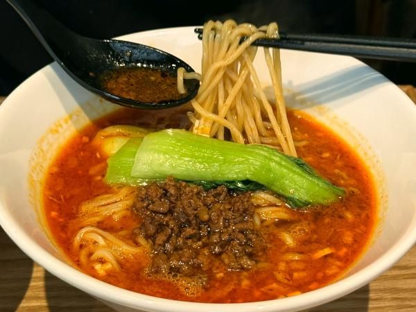 山椒や唐辛子、胡麻の香りが一瞬で口に広がるスープが自慢の担々麵。濃い色ではありますが味は濃厚すぎず、すっきりとした味わいです。