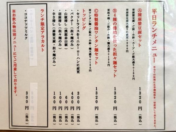 平日ランチは「陳麻婆豆腐セット」「4種の醤油を使った担々麺セット」「特製醤油ワンタン麺セット」の3種類。