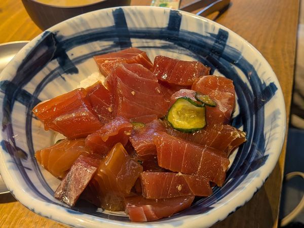 色々な魚の切り身の漬けが入ったボールから、自分でお玉でひとすくいして完成させるどんぶりです。