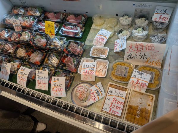 魚介コーナーはおいしそうなお刺身から、初めてお目にかかる珍しい商品までが所せましとズラリ…