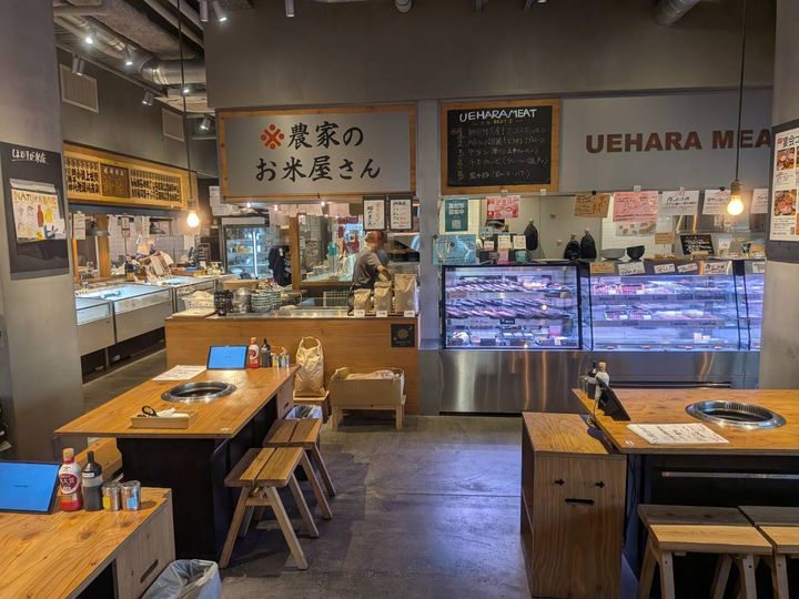 などの各コーナーで、好きな料理や材料を購入して、席のバーベキュースペースでじゅうじゅう焼いて楽しめるシステム!しかも、お店ごとに会計できるから、お財布事情に合わせてカスタマイズもできちゃうんです。