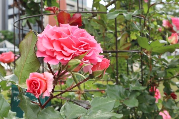 ふと目線を上げるとフェンスを伝うピンクや白のバラが目に映ります。高さがあり、遠くから眺めても綺麗!
