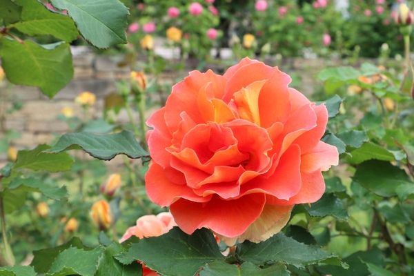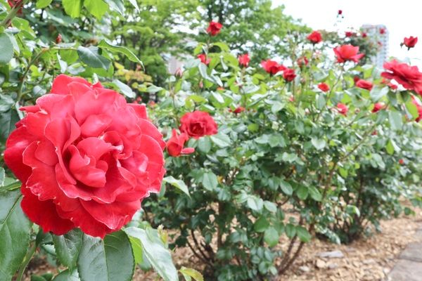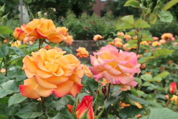少し歩くと見えてくるのが赤や黄、オレンジなど暖色系の綺麗なバラ。華やかな気持ちになります。
