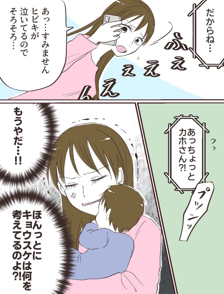 「だからね・・」義母の言葉と同時に「ふええええん!」と泣き声が!「あっ・・うみません。ヒビキが泣いてるのでそろそろ・・」と言うと、「あっちょっとカホさん!?」義母の言葉も遮って電話を切り、「もうやだ・・!!ほんっとにキョウスケは何を考えてるのよ!?」とまた怒りが!