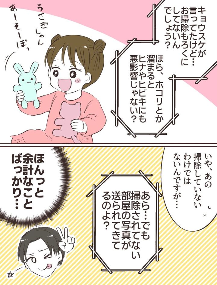 義母はかまわず、「キョウスケが言ってたけど・・お掃除もろくにしてないんでしょう?ほら、ホコリとか溜まるとヒナやヒビキにも悪影響じゃない?」と言い、「いや、あの掃除してないわけではないんですが・・」と言う私の言葉を遮って「あら・・でも掃除されてない部屋の写真が送られてきてるのよ?」義母の言葉を聞いて、「ほんっと余計なことばっかり・・」と呟く私。