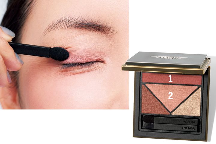 1.二重幅に塗布。2.で境目をぼかす。赤みピンクはシワまでもふっくら見せてくれます。