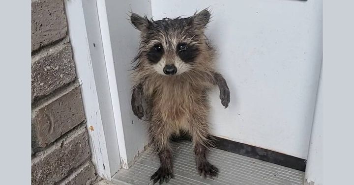 玄関に小さな門番が!「二本足で立つ」ずぶ濡れの赤ちゃんアライグマが発見される