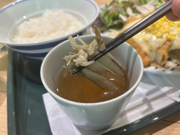 鶏肉とゴボウが入った付け合わせのスープは、ほんのりとゴボウの香ばしい風味を感じられるやさしい味わいで、何杯でも飲みたくなるおいしさ。