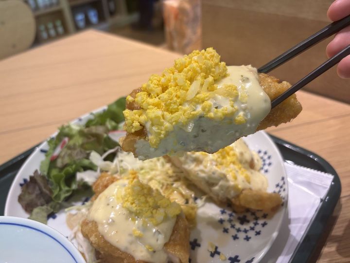 タルタルソースの上には、食感をプラスしてくれるいり玉子と刻みタマネギがたっぷり。自家製の甘口南蛮酢とコクがあるタルタルソースに、ふんわりとしたいり玉子とシャキシャキとしたタマネギの食感が相性抜群でした。